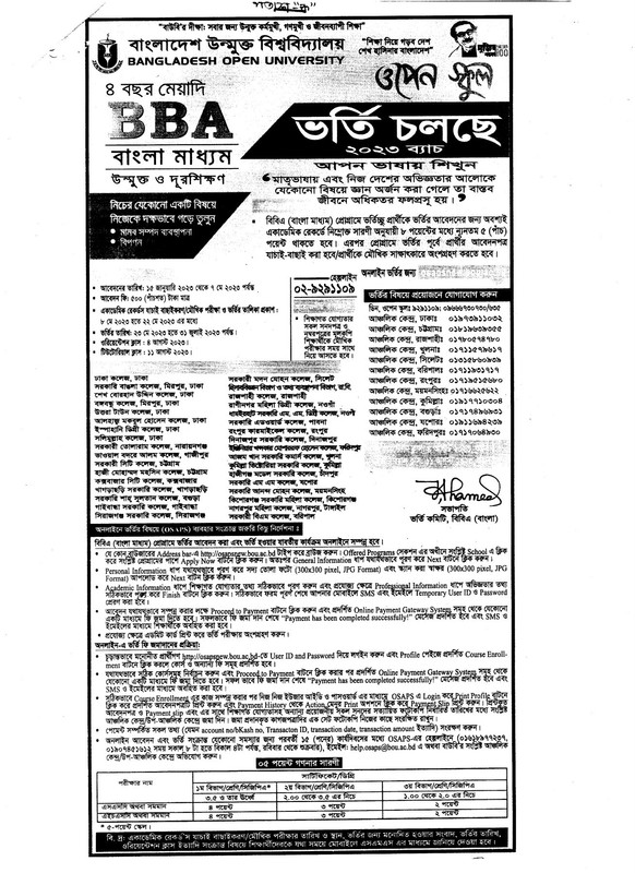 উন্মুক্ত বিশ্ববিদ্যালয়ে বিবিএ বাংলা মাধ্যম ভর্তি বিজ্ঞপ্তি ২০২৩
