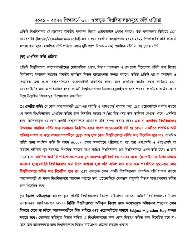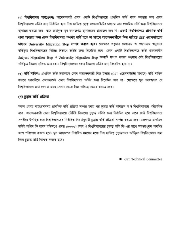 জানানাে হবে) সংশ্লিষ্ট বিশ্ববিদ্যালয়ে জমা দিতে অপারগ হলে ভর্তি বাতিল হয়ে যাবে এবং পরবর্তিতে GST-এর কোন বিশ্ববিদ্যালয়ে ভর্তির জন্য বিবেচিত হবে না। GST গুচ্ছভূক্ত কোন একটি বিশ্ববিদ্যালয়ে প্রাথমিক ভর্তি সম্পন্ন করলে আবেদনকারী যে সকল বিশ্ববিদ্যালয়ে আবেদন করেছে তার প্রত্যেকটিতে মেধাক্রম অনুযায়ী বিভাগ মাইগ্রেিশনসহ ভর্তির জন্য বিবেচিত হবে।