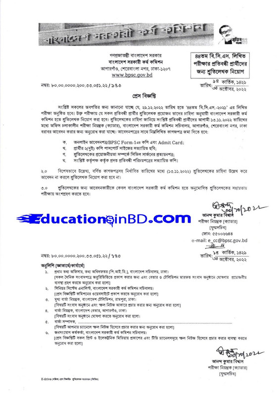 ৪৪তম বিসিএস পরীক্ষায় শ্রুতিলেখকের জন্য আবেদন আহ্বান