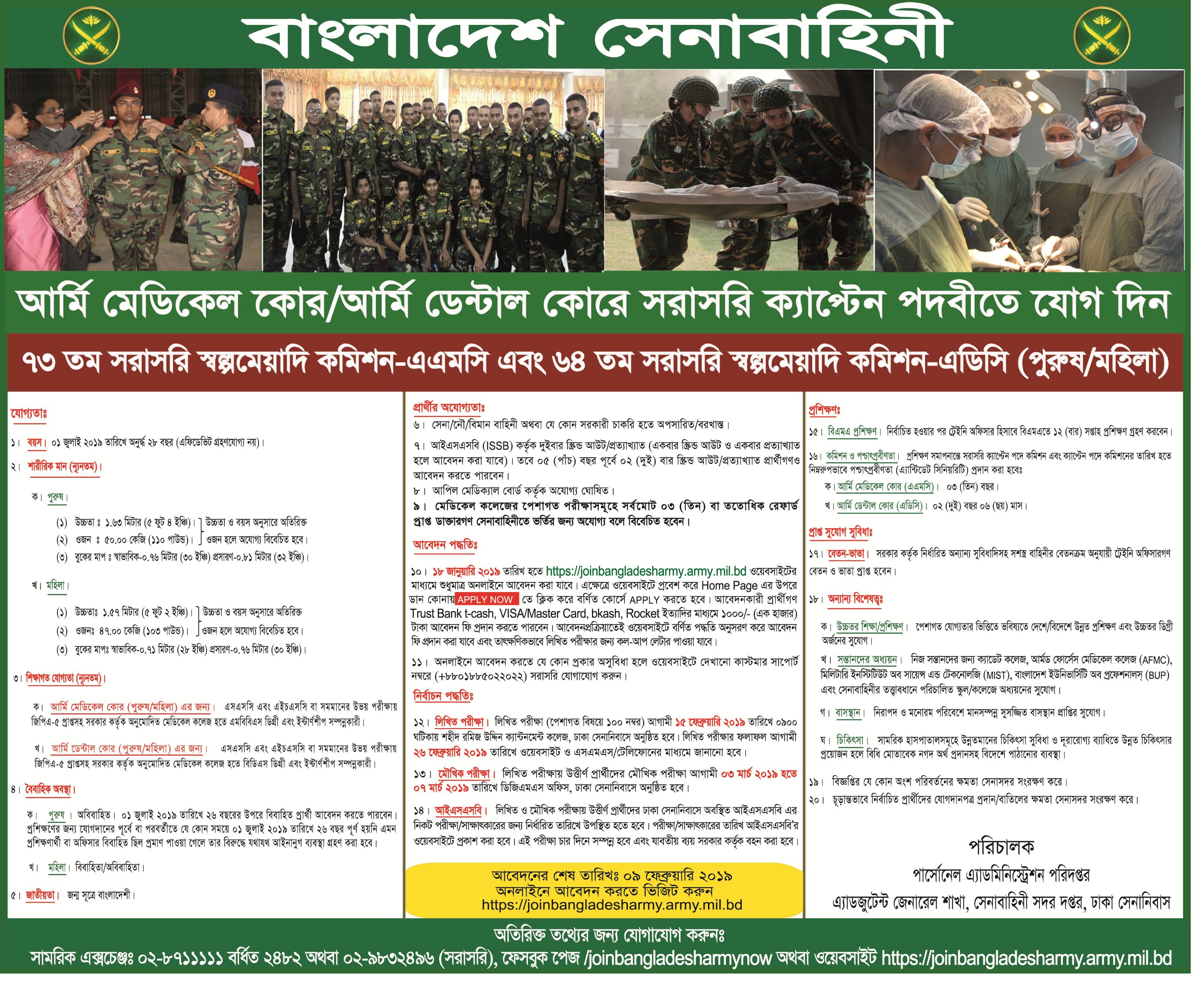 বাংলাদেশ সেনাবাহিনী (আর্মি) নিয়োগ বিজ্ঞপ্তি ২০১৯