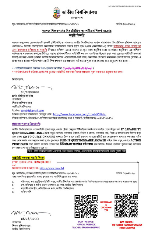 অনলাইন প্রশিক্ষণে মনােনয়ন প্রত্যাশী স্নাতক (সম্মান) ও স্নাতকোত্তর কলেজ পর্যায়ে পাঠদানকারী শিক্ষকগণকে উক্ত প্রশ্নমালা সঠিকভাবে পুরণ করে প্রেরণের জন্য অনুরােধ করা হয়েছে।