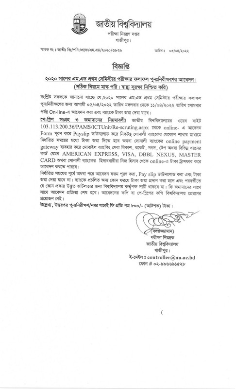 পে-প্লিপ সংগ্রহ ও জমাদানের নিয়মাবলীঃ জাতীয় বিশ্ববিদ্যালয়ের ওয়েব সাইট 103.113.200.36/PAMS/ICTUnit/Re-scruting.aspx থেকে online- এ আবেদন ফরম পূরন করে Payslip ডাউনলোাড করে নিকটস্থ সােনালী ব্যাংকের যেকান শাখার মাধ্যমে নির্ধারিত সময়ের মধ্যে টাকা জমা দিতে হবে