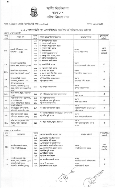 ২০২৩ সালের ডিগ্রী পাস ও সার্টিফিকেট কোর্স ১ম বর্ষ পরীক্ষার কেন্দ্র তালিকা PDF Download