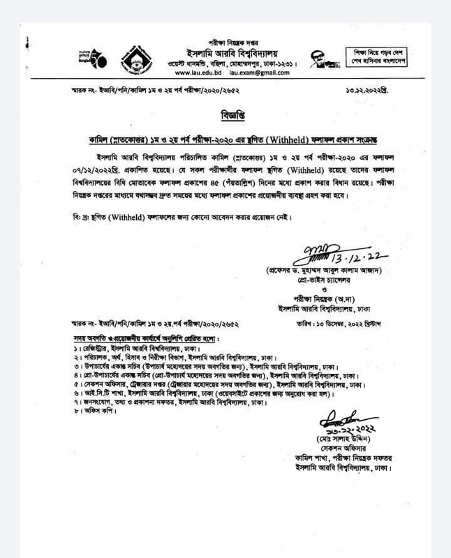 ইসলামি আরবি বিশ্ববিদ্যালয় পরিচালিত কামিল (স্নাতকোত্তর) ১ম ও ২য় পর্ব পরীক্ষা-২০২৪ এর ফলাফলে যে সকল পরীক্ষার্থীর ফলাফল স্থগিত (Withheld) রয়েছে তাদের ফলাফল প্রকাশ করা হয়েছে। প্রকাশিত ফলাফলে কোন প্রকার অসঙ্গতি বা ভুলক্রটি পরিলক্ষিত হলে তা সংশােধন অথবা ফলাফল সম্পূর্ণ বাতিল করার ক্ষমতা ইসলামি আরবি বিশ্ববিদ্যালয় সংরক্ষণ করে।